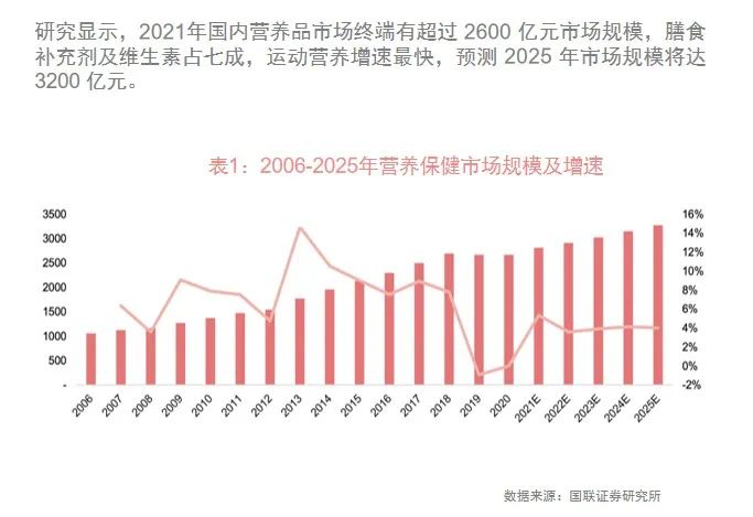 据国联证券研究所发布的数据显示,2021年,我国国内营养品市场已经超过2600亿元。2022年发布的《Z世代营养消费趋势报告》更是指出,我国保健食品市场仅次于美国,位列全球第二。其中,18-35岁的年轻消费人群占据了城市保健食品市场的83.7%。