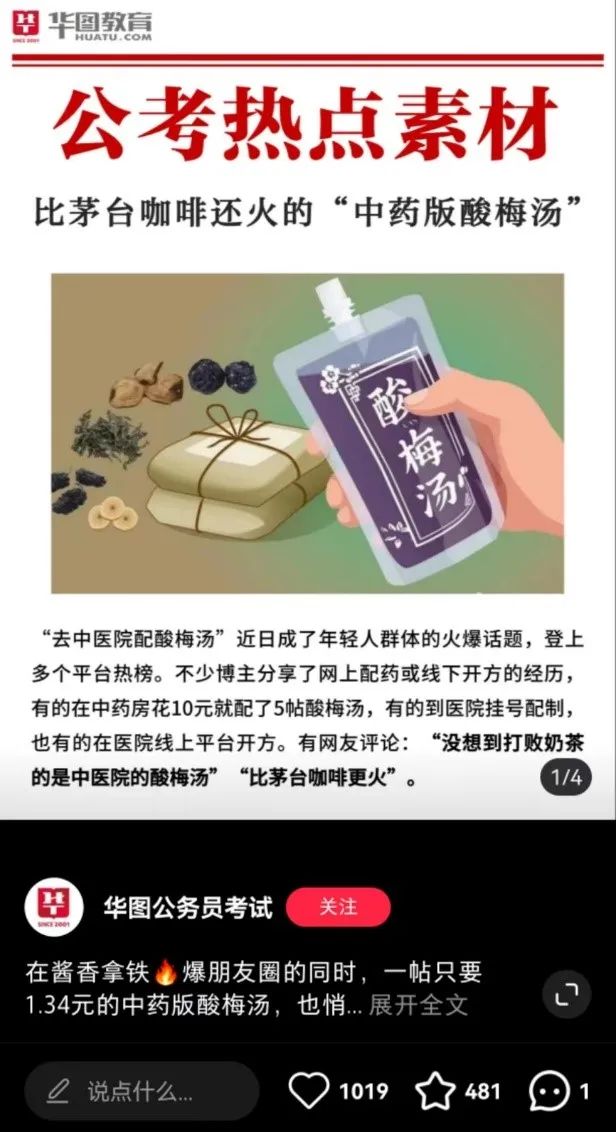 中药版酸梅汤的爆火甚至惊动了考公界,成为各大公考教育机构的热点素材,重点分析。