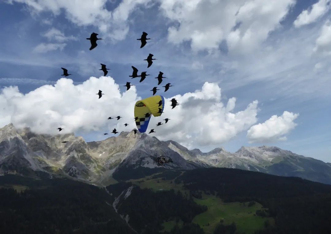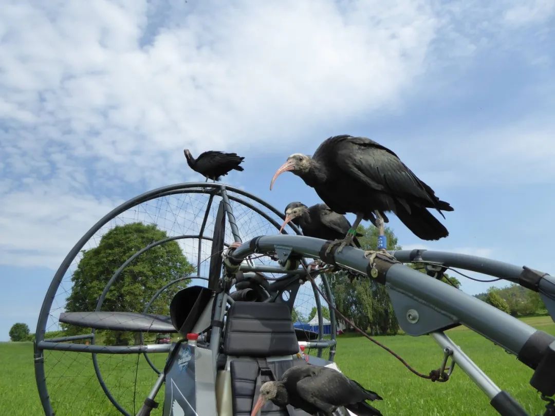 与此同时,他每天都会带着小鸟去滑翔机旁,适应滑翔机的巨大轰鸣声,并带着鸟儿在奥地利萨尔茨堡上空短距飞翔,为长途迁徙至意大利的托斯卡纳区做准备。由于印随行为,即使他驾驶着飞机,它们也会毫不犹豫地跟上来。