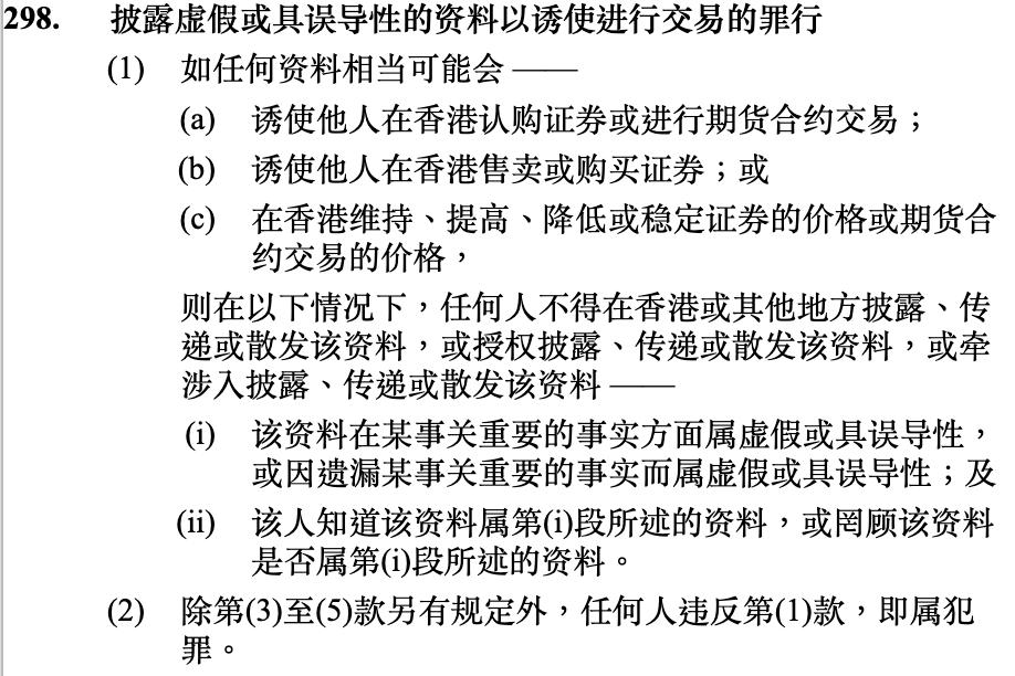 香港《证券及期货条例》第298条规定了“披露虚假或具误导性的资料以诱使进行交易的罪行”。
