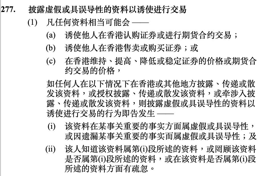 香港《证券及期货条例》第277条规定了“披露虚假或具误导性的资料以诱使进行交易的行为”。