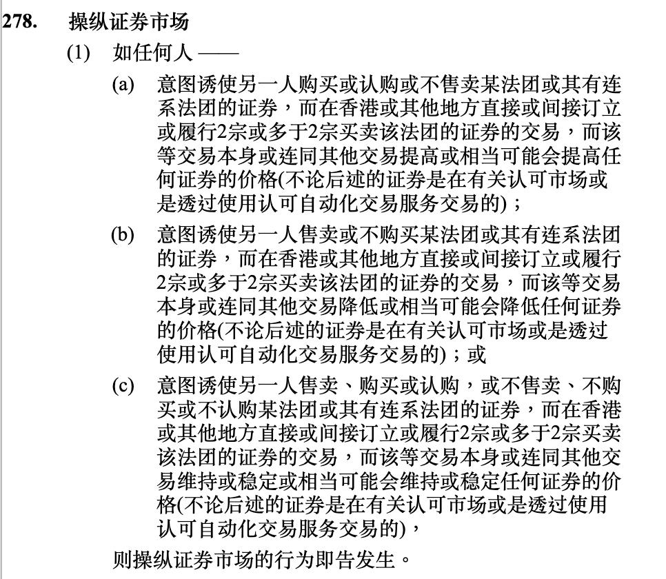 香港证据监管法律主要是《证券及期货条例》,其第278条是关于操纵证券市场的规定。