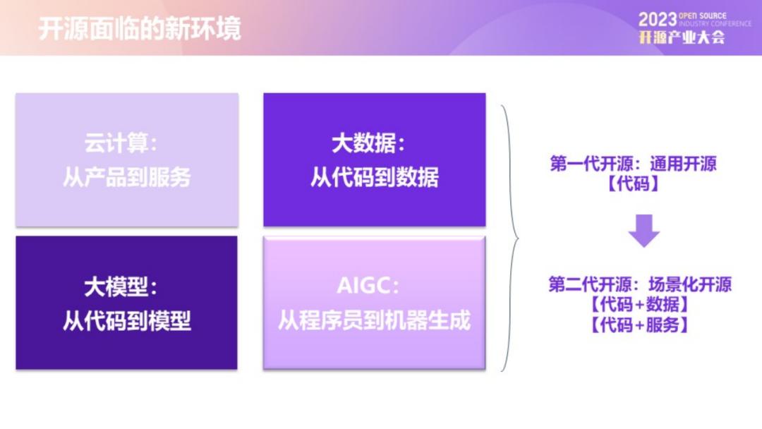 但OSI的这10大原则,诞生于20多年前,聚焦的是软件代码,更多是关于软件产品,属于通用开源范畴。近年来,开源的这一经典定义面临着新的挑战与重构,尤其是来自云计算、大数据、大模型和AIGC的挑战,让开源早已不在局限于通用领域,更多转向聚焦于数据、服务等场景化开源。