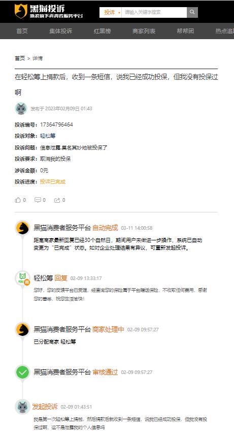 黑猫消费者平台上关于轻松筹的投诉众多,比如2月的一条投诉中,用户表示:我是第一次轻松筹上捐钱,然后捐款后就收到一条短信,说我已经成功投保,但我没有投保过啊,这不是泄露我的个人信息吗!