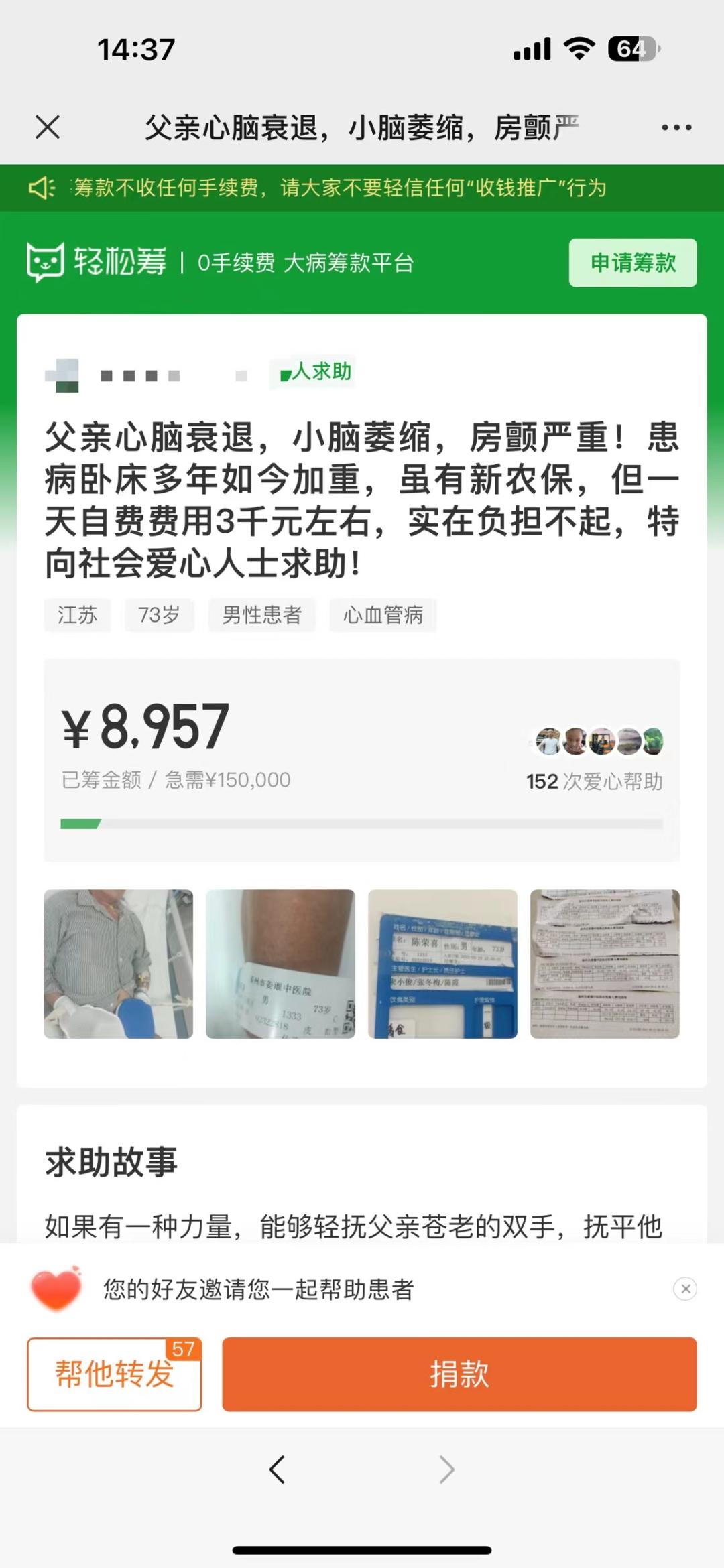 他的儿子被查出白血病,他已倾尽全家财力,但还是没凑够高额的手术费、治疗费。入院陪床期间,有所谓“志愿者”找到他称,可以在轻松筹帮他筹款,但会收取一定比例的佣金。陈先生觉得,“志愿者”好心帮忙,又搭功夫又搭人情,收取一定佣金也正常,于是在“志愿者”的帮助下发布了求助信息。