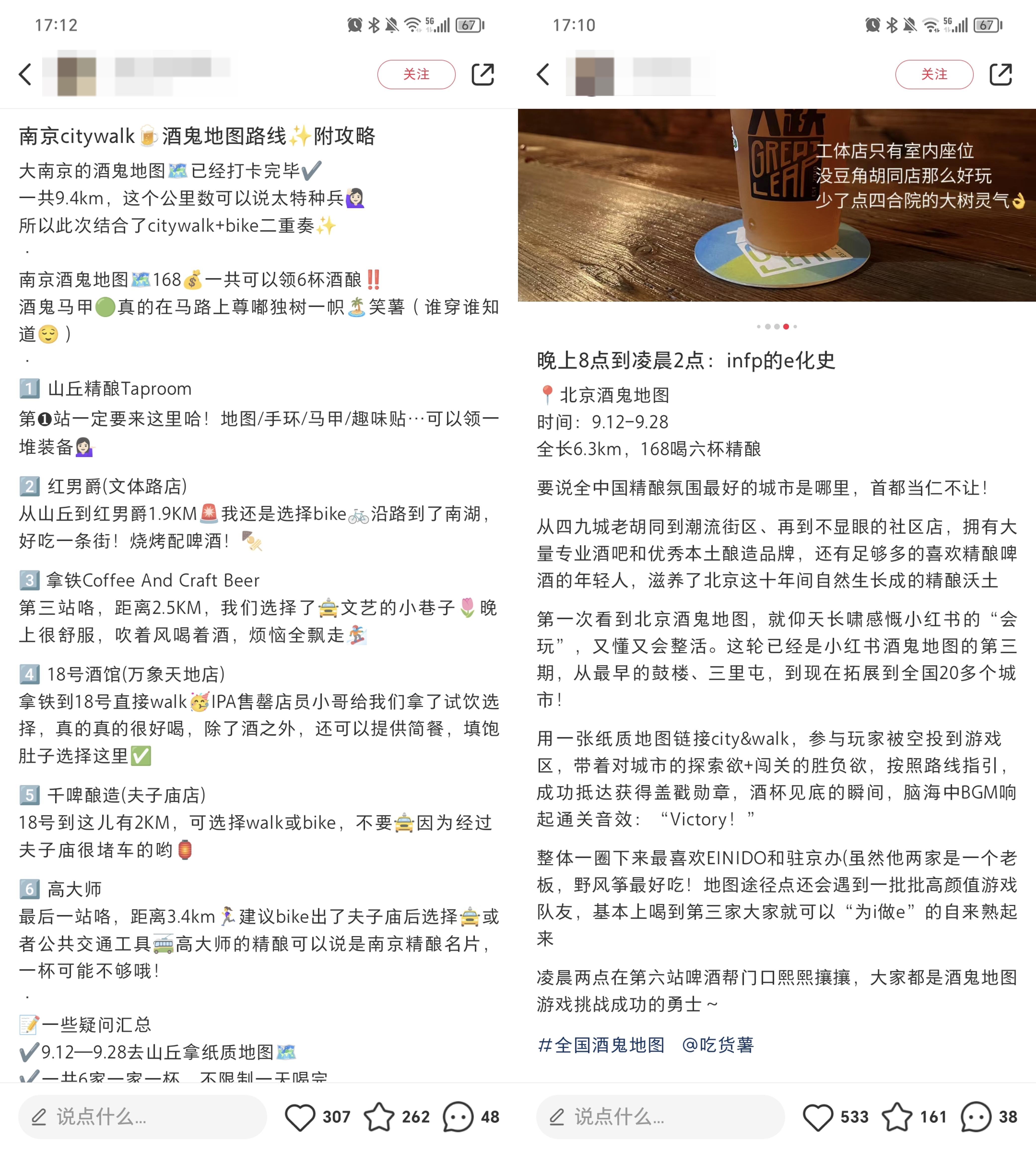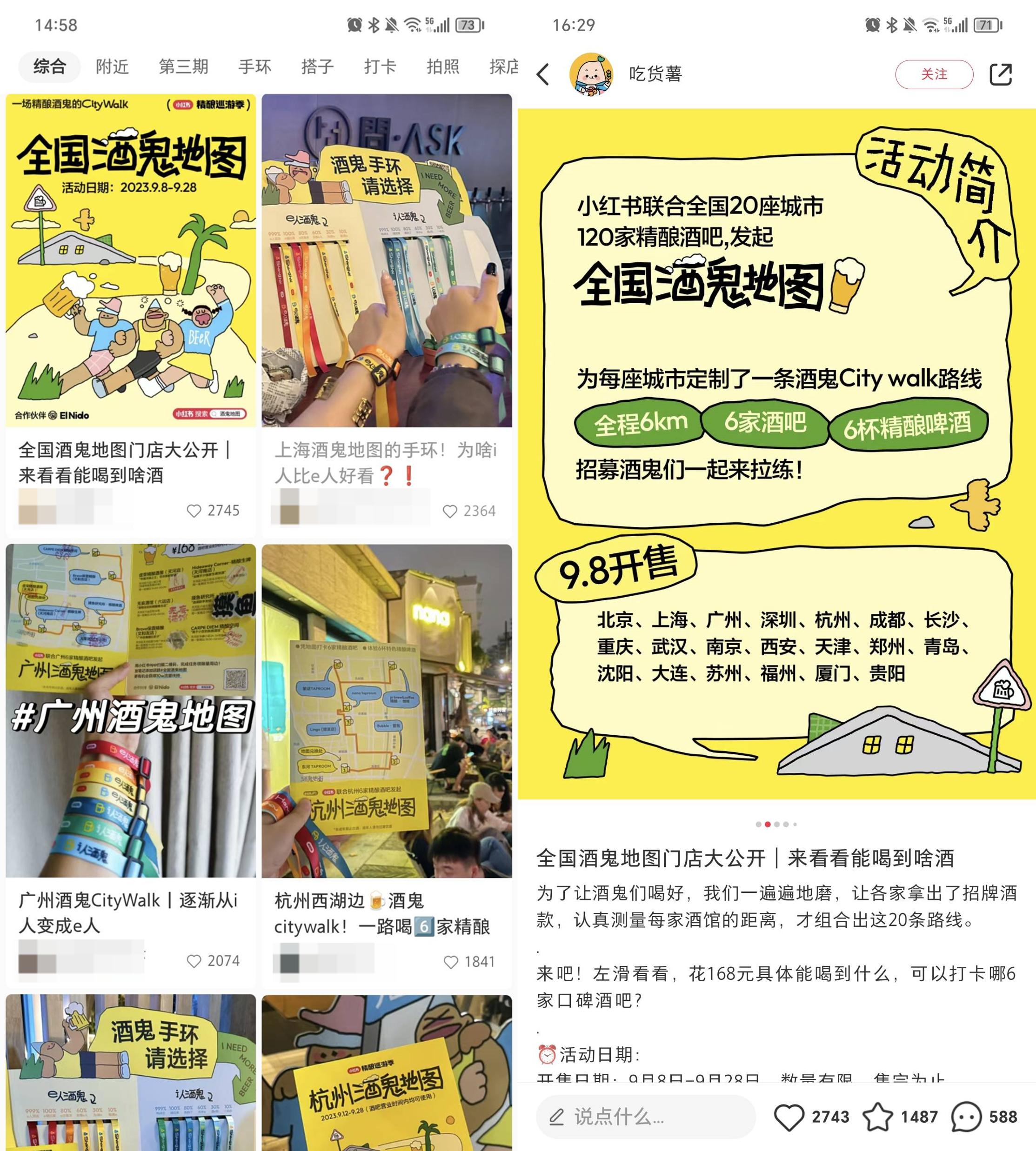 在这次活动中,小红书挑选了20个城市,设计了酒吧主题的citywalk,参与者可以沿着路线打卡当地口碑酒吧,价值168元的地图套票可以在6家酒吧喝6杯酒,近乎半价,属实是非常良心的薅羊毛活动了。