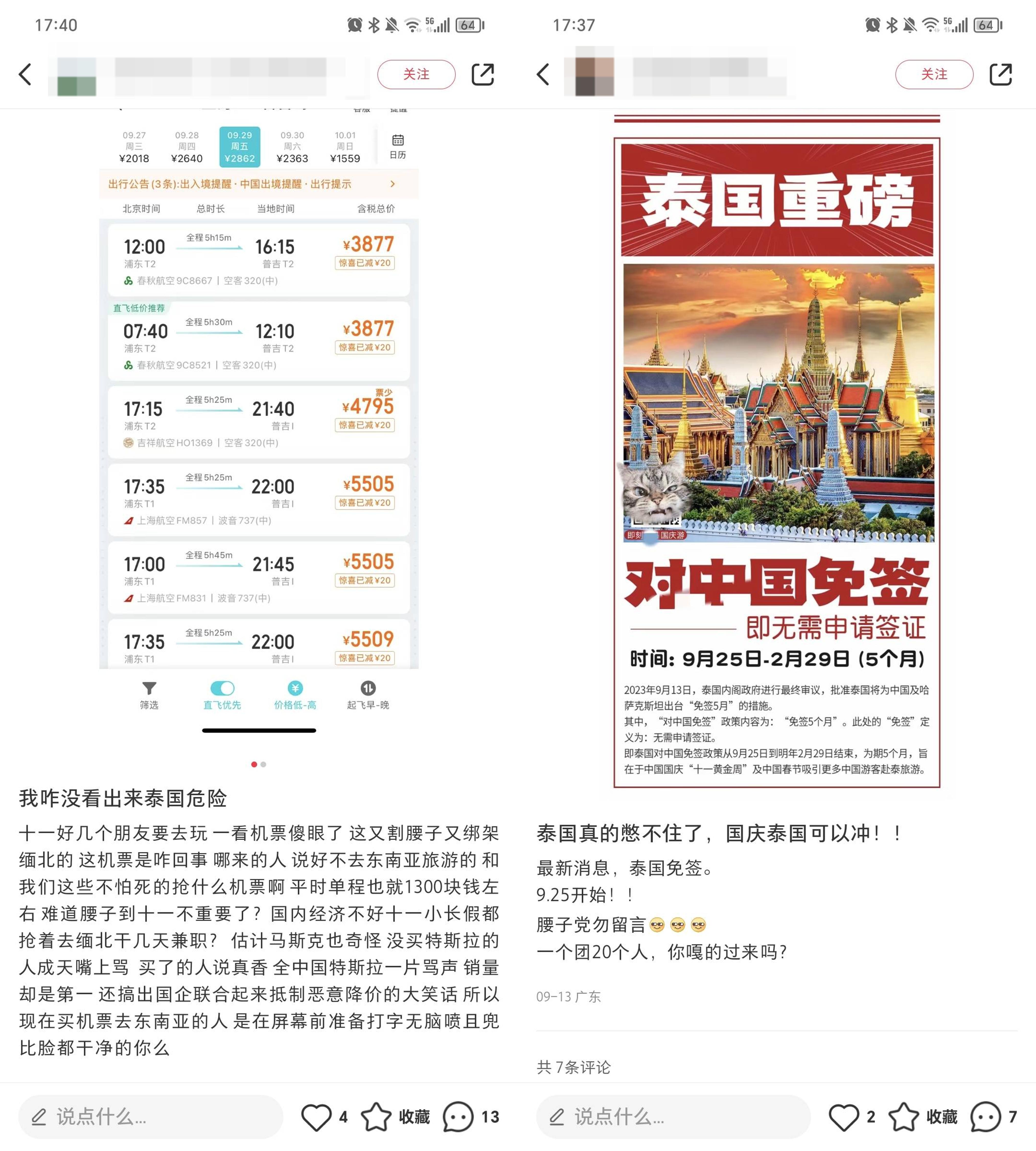 东南亚这边,虽然今年以来东南亚噶腰子、电信诈骗等新闻让人恐慌,但当地政府还是大力推进旅游业,吸引中国游客。泰国免签政策鼓舞了不少没来得及提前做计划的人,大家对机票价格的吐槽也能看出,真的被劝退的人并不多。