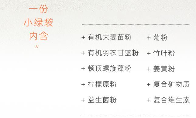 一份小绿袋5g,里面有10种单看一眼就能让人倍感健康的高级成分,营养表更是超过了21种;