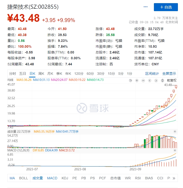 个股方面,华为概念股捷荣技术今日再度涨停,报43.48元/股。这已是其近20个交易日第15次涨停,股价再创历史新高。