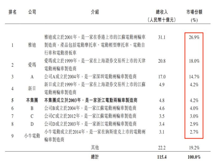 在市场排名上,根据弗若斯特沙利文的资料,以2022年总收益计,绿源是中国内地市场排名第五的电动两轮车制造商,但市场占有率仅为4.2%;而同年,雅迪、爱玛、台铃则分别获得26.9%、18.0%、14.7%的市占率,绿源还不如它们的一个零头。