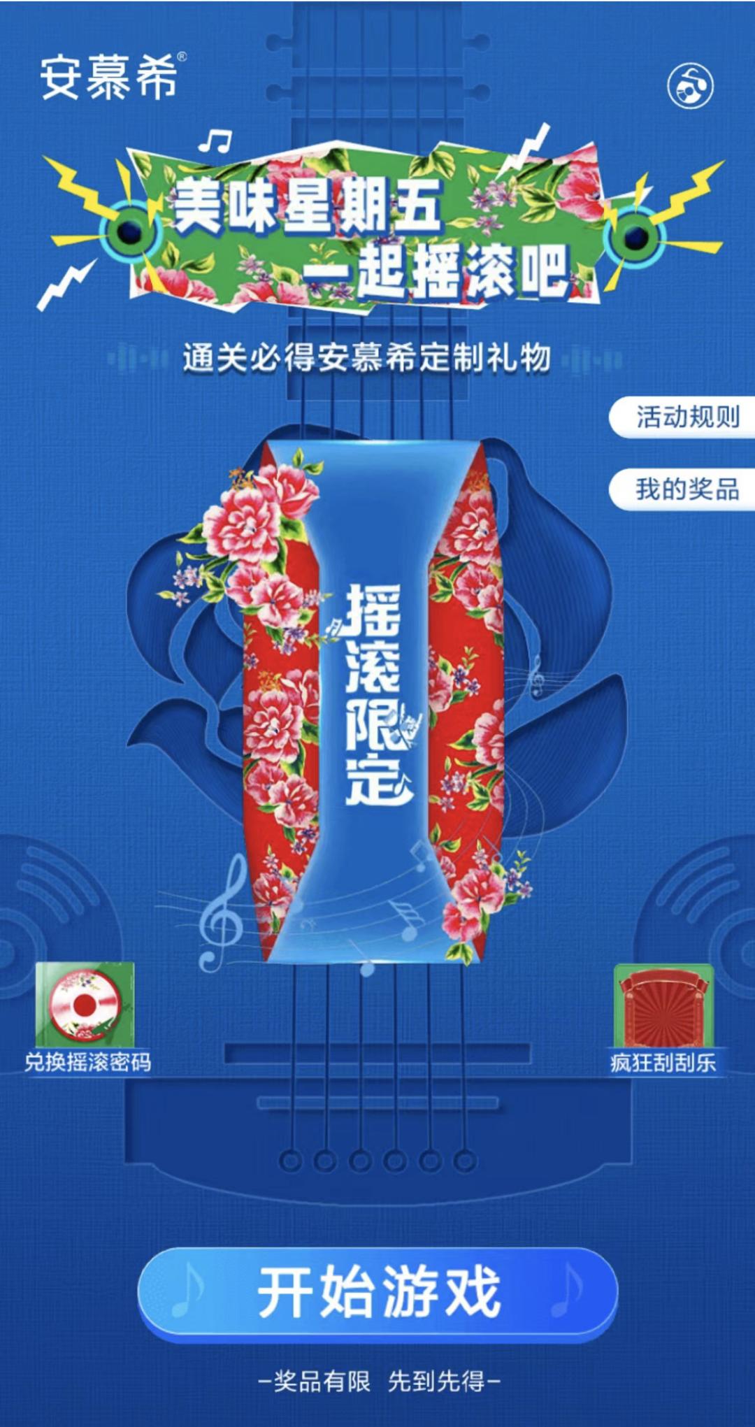 一个值得注意的方向是,安慕希将乐夏3中弥漫的摇滚氛围和二手玫瑰的“东北摇滚”风格结合为视觉要素,安置在对于消费者数字化运营过程中。先是在小程序开发音乐游戏,并在全网展开收集“摇滚密码”可兑换产品周边的活动,尽可能地调用消费者兴趣,让不听摇滚的消费者也能从摇滚音乐的魅力中收益。