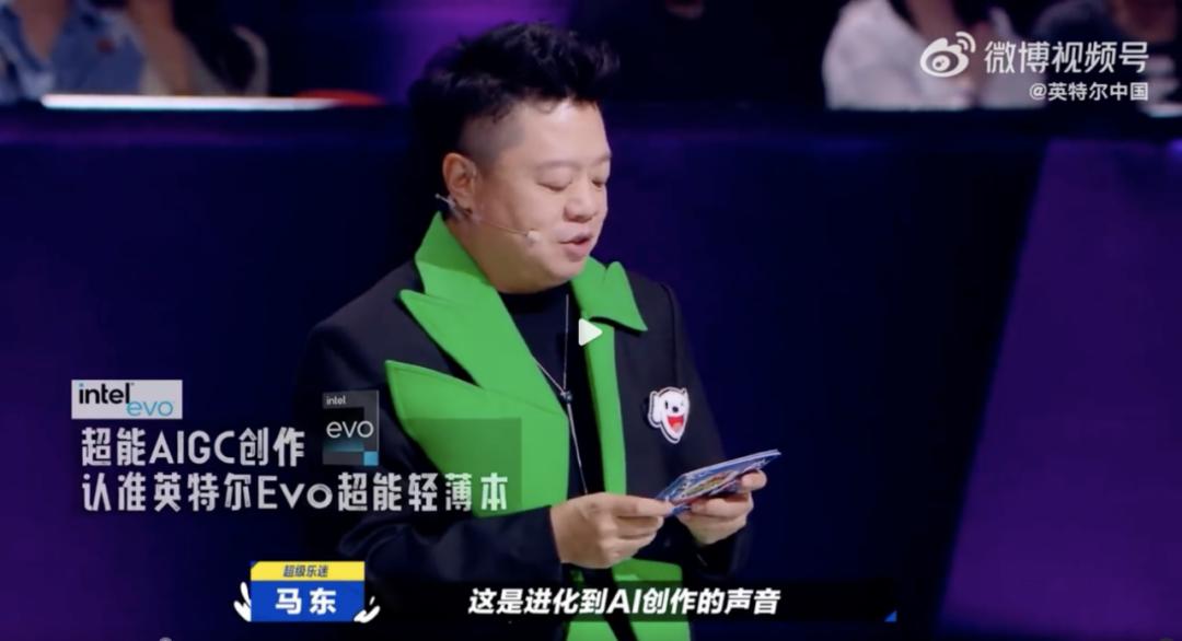 这是与传统营销场景截然不同的定位。以往跨圈合作的传播性在于,两个风马牛不相及的领域碰撞,所产生的反差感与不可思议感,让人产生的好奇。而在英特尔的尝试中,一种新场景被塑造成功:综艺中的内容属性音乐,与产品中的价值属性科技,在AIGC这一热点中完美耦合。