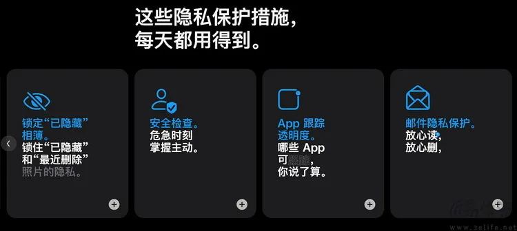 可能有的朋友会说,这种类似的、让用户自行设定应用权限,并给予用户密码最高级别加密保护的特性,其他机型上也有。但如果有用过iPhone、或者哪怕是看过苹果官网上“隐私保护”的相关内容就会意识到,苹果从来都将隐私保护的各种功能提示,放在了十分显眼的位置,并通过各种机会告诉用户应该重视自己的隐私权,以及应该如何用好iPhone里的各种功能和技术来保护自己的利益。