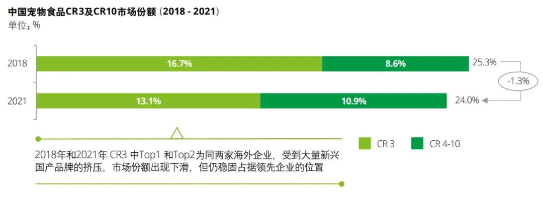 尽管国内宠物市场参与玩家众多,但行业同质化竞争正加剧,缺少拥有绝对竞争力的头部本土品牌。亚宠研究院《2022宠物行业蓝皮书》显示,2021年我国宠物市场份额前10的企业市占率均为个位数,且其中本土仅有华兴、中宠两家老牌企业在列,二者都是代工起家,旗下品牌力狼、Wanpy顽皮虽也有一定名气,但市占率依然不足3%。因此,当前本土新锐品牌想要脱颖而出,着重打出特色心智或许更具可操作性。
