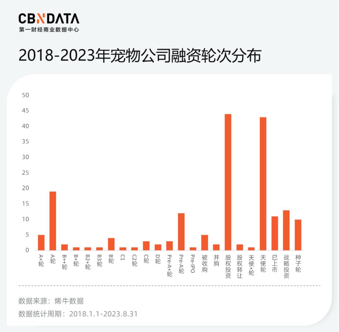 值得一提的是,疫情后资本对宠物行业的关注度也有提高。2020年前后两个完整自然年融资企业数量之和相差近一半,2023年前8个月,相关融资企业数量也已经来到26个,直逼2019年全年数量。