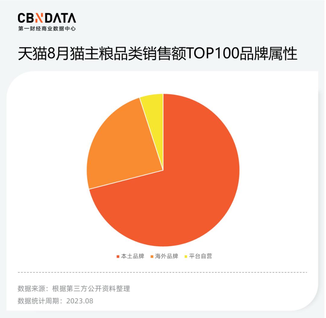 主粮品类各个品牌的厮杀则更为激烈。以猫主粮为例,天猫8月销售额TOP100的品牌中,超过7成是本土品牌店铺。在抖音,国货强势的局面也在延续。飞瓜数据显示,8月猫主粮和狗主粮品牌销售额TOP50品牌中,分别仅有7个和3个海外品牌。