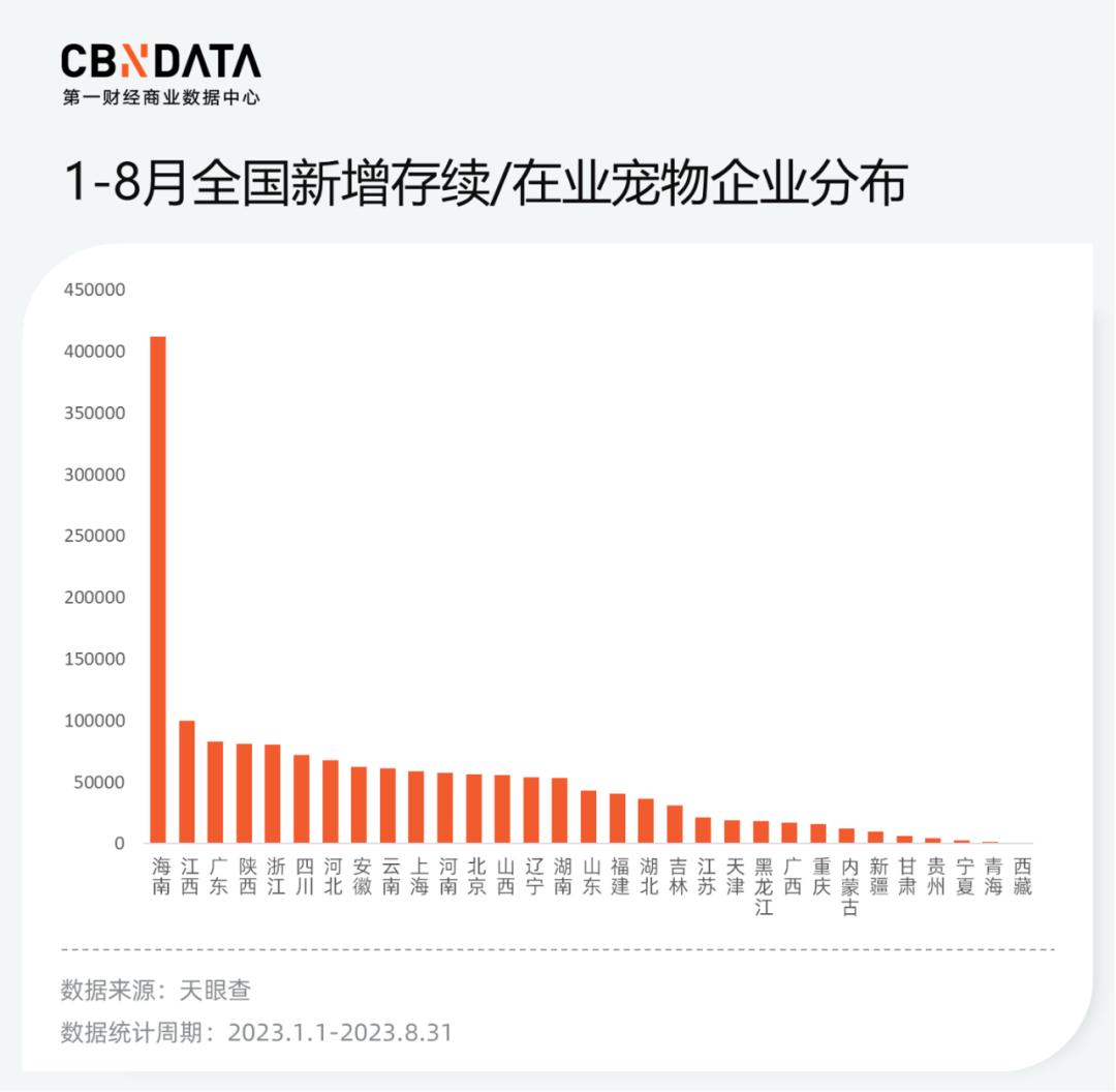 具体到各省市来看,因持续受益于海南免税政策优惠红利,前8个月海南新增宠物相关企业超过41万家,数量最多;其余除西部少数地区外,企业注册数量均已上万。