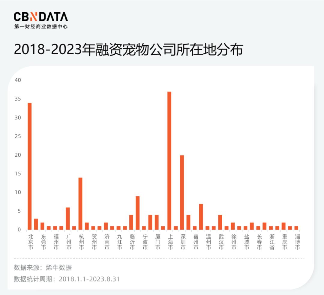 从所在地来看,融资企业多集中在沿海一带。除北京、上海向来都是热门地区,相关企业在山东、广东、江苏、浙江多个城市也吸引了不少宠物企业入驻,例如深圳的宠物智能硬件公司霍曼科技、杭州的功能性宠物食品品牌BRIGHT布兰德、知名代工厂汉欧的母公司临沂帅克宠物等。