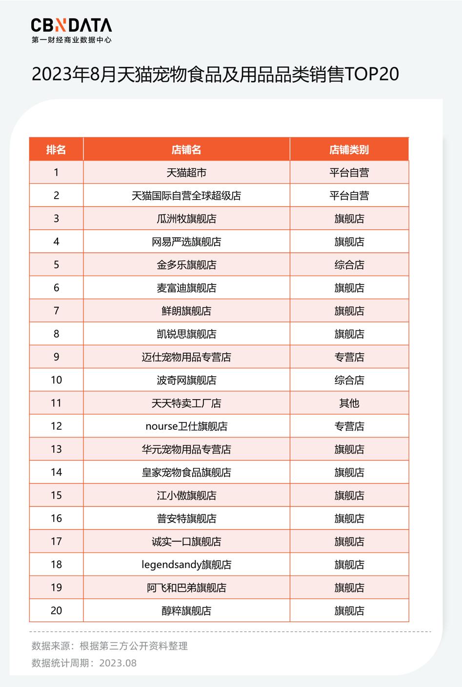 宠物国货崛起从各电商渠道的销售排名中也可见端倪。根据第三方公开资料整理数据,8月天猫宠物食品及用品品类销售额排名TOP20中,除了天猫超市、天猫国际、天天特卖和皇家4个店铺,其余16家均为本土品牌,其中12家都有售卖宠物食品。