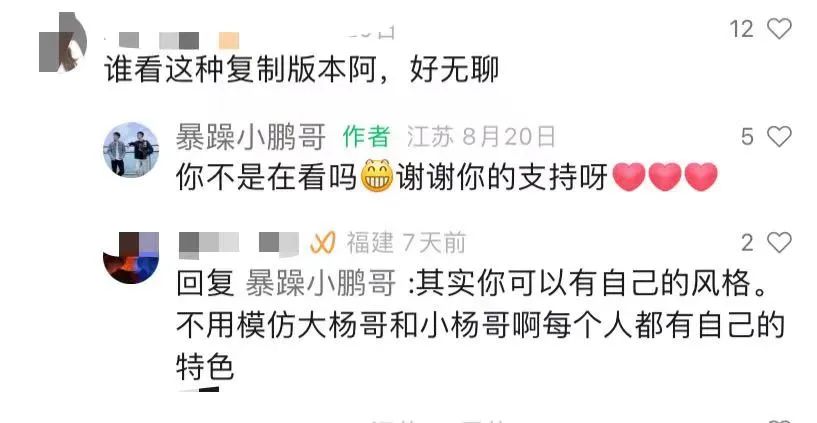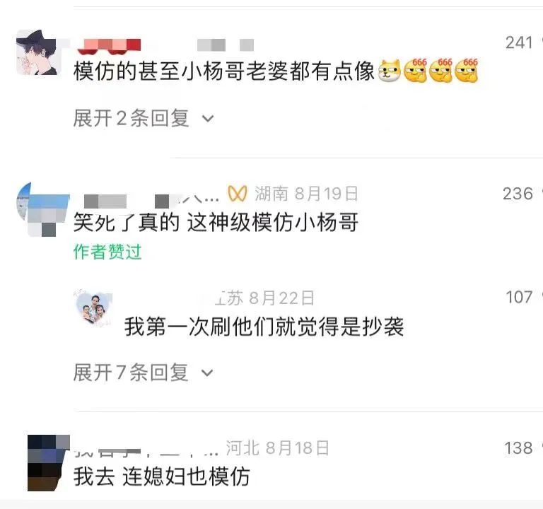 对此,小杨哥方也做出了回应,表示模仿没事,只要有创新就行。但这种一比一复制就是抄袭,如果有人继续抄袭,会采取相应的措施。