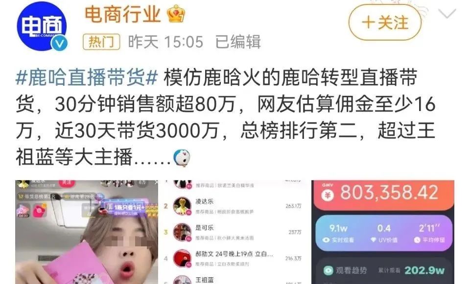 虽然鹿哈直播带货时间才仅仅几个月,但气人却非常高。甚至曾经高居抖音带货榜总榜第二位,超过了王祖蓝等大主播