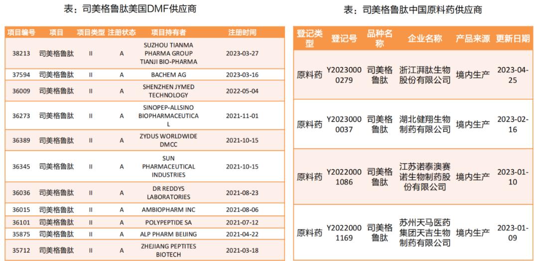 从目前原料药的激活备案企业数量来看,胸腺五肽、生长抑素、醋酸奥曲肽等品种的原料药企业分别为55家、19家、19家,竞争十分激烈;而司美格鲁肽、利拉鲁肽等高难度的高端产品,国内合格的原料供应商更是仅为4家。