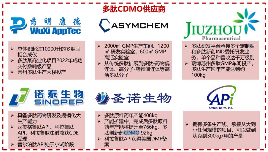 去年生物医药领域的爆款“新冠口服特效药”为国内CDMO公司创造了上百亿元的收入,相关CDMO公司业绩直接爆表。今年失去了“新冠”药物加持,各大CDMO公司业绩增长大幅放缓。如今GLP-1药物的大火,也让国内各大CDMO企业摩拳擦掌,其中既包括CXO巨头药明康德、凯莱英、九洲药业等,也包括一些专注多肽领域的CDMO公司圣诺生物、诺泰生物等。