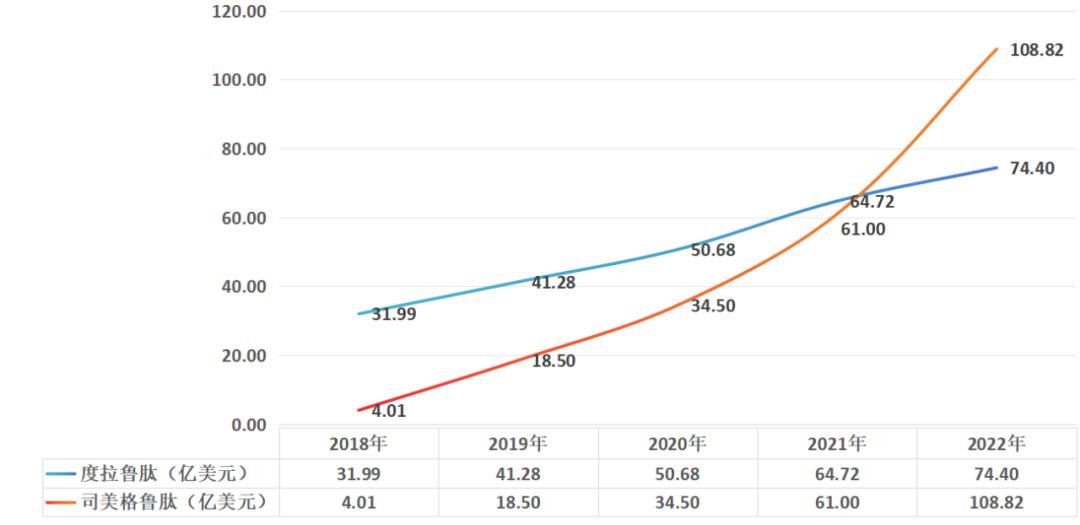 显著的疗效,加上两大超级大市场,让GLP-1药物的销售额不断刷新人们的预期。2022年全球已获批上市GLP-1药物整体销售规模已达225亿美元规模以上,其中司美格鲁肽、度拉糖肽销售额分别达108.82亿美元、74.4亿美元。