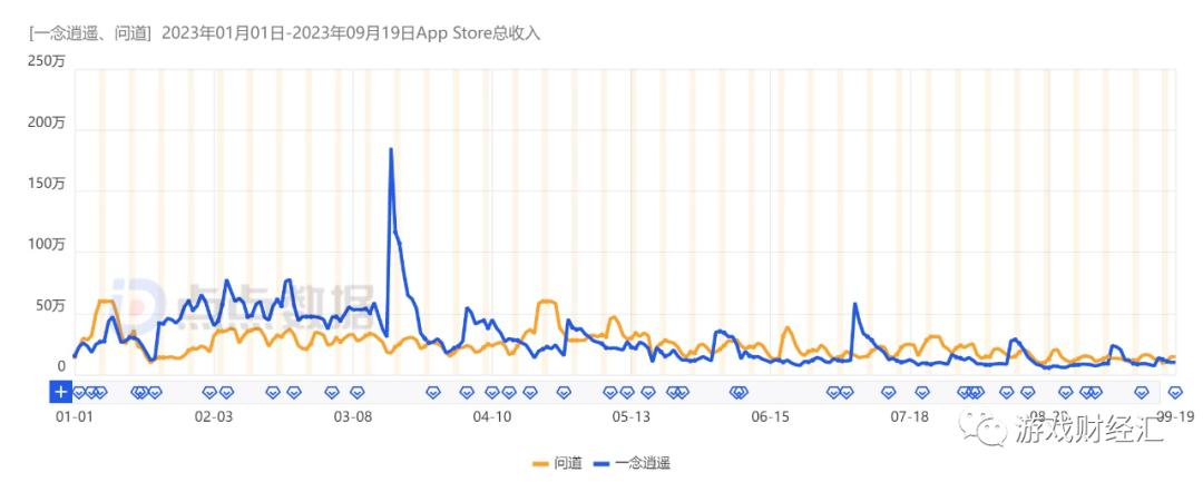 图: 《问道手游》、《一念逍遥》iOS收入趋势;来源:点点数据