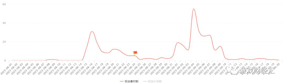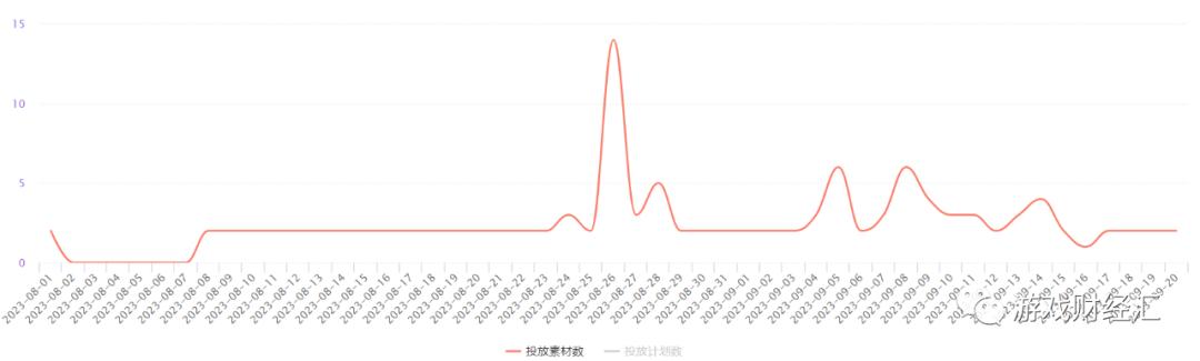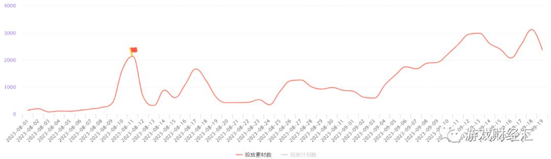 由下图,《这个地下城有点怪》投放“一波流”,上线首日投放了3000多组素材,进入9月几乎0投放。《飞吧龙骑士》倒是持续投放,但上线当天仅投放了2000多组素材。
