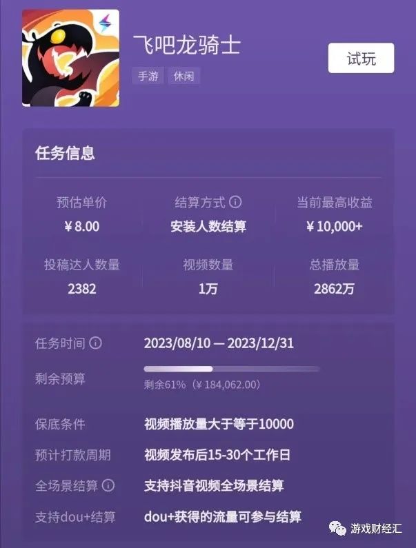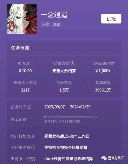 同时,《一念逍遥》《飞吧龙骑士》等游戏也参加了抖音发行人计划,两款产品单个用户安装成本在10元左右,大幅低于买量。