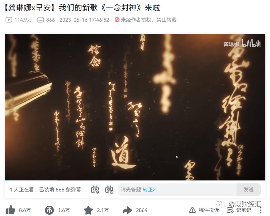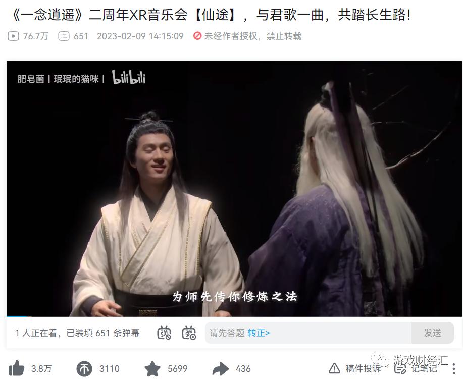 《一念逍遥》年内至少进行了三次音乐内容营销:1月二周年庆举办了二周年XR音乐会《仙途》,5月邀请龚琳娜和早安共同演绎全新印象曲《一念封神》,该视频B站播放量超百万,7月邀请陈楚生、张远演唱遮天主题服战歌《不熄》。