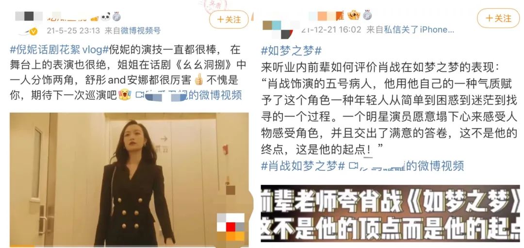 倪妮出演《幺幺洞拐》后,社交媒体上出现大量有关倪妮话剧演技的帖子,以及排练花絮、相关人士点评等内容;肖战出演《如梦之梦》后,社交媒体上也同样涌现相关内容,粉丝也乐得分享转发,并以观众反馈及专业人士点评佐证肖战演技在《如梦之梦》后得到精进与提升。大众视线中,台上8个小时的演出以及台下的刻苦排练,似乎也足够证明肖战作为话剧演员的努力与勤奋。