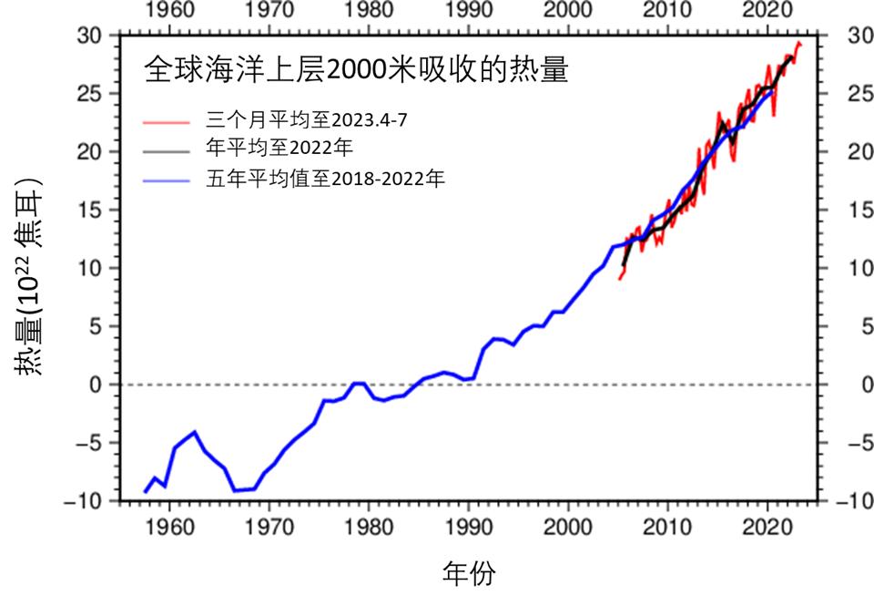 根据最新数据,全球海洋最上面的2000米吸收的能量自1990年以来逐年上升,仅今年前七个月,上升的能量已经比2022年的平均高出至少10^22焦耳[2]。