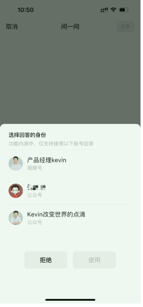 进入微信问一问,回答贴将是以选择的身份展示,比如你选择公众号身份就是展示公众号名称、头像,视频号则是展示视频号头像、名称。