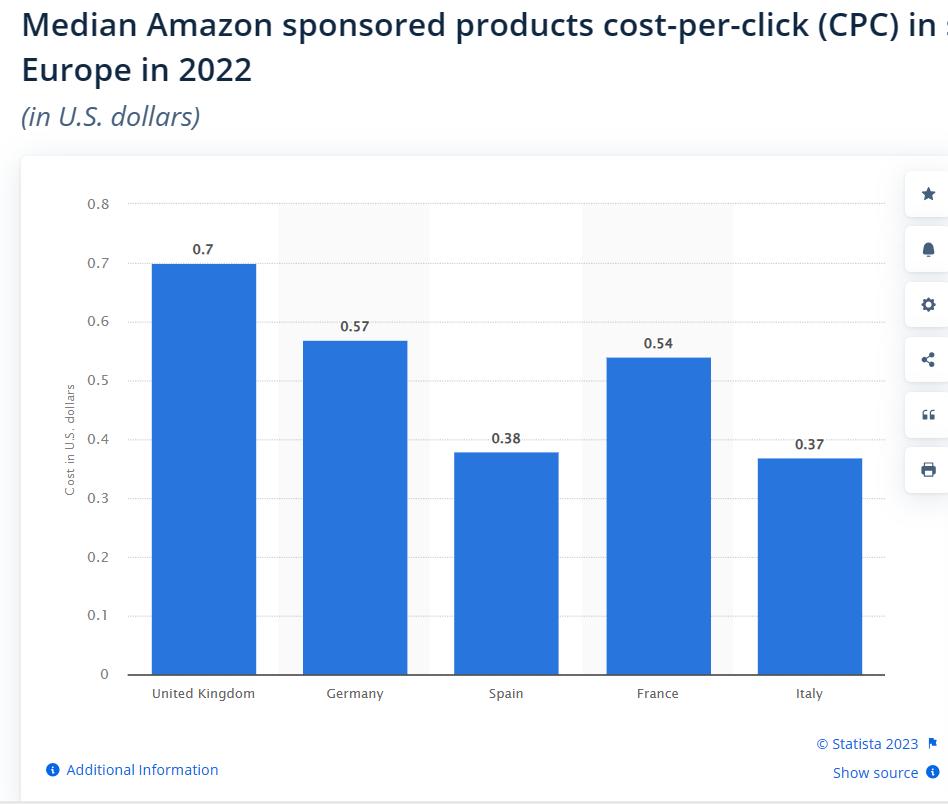 图:2022 年西欧五国亚马逊 SP 广告CPC 中位数(美元)| 来源:Statista