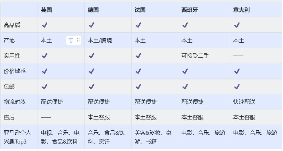 亚马逊对 2022 年英国、德国、法国、西班牙、意大利这 5 个国家市场消费数据进行了研究,发现不同国家市场之间,存在一些普遍共性,例如,消费者普遍偏好高品质商品;对方便实用、节省时间的产品感兴趣;注重价格;更偏好购买方便、配送便捷的购物体验等等。