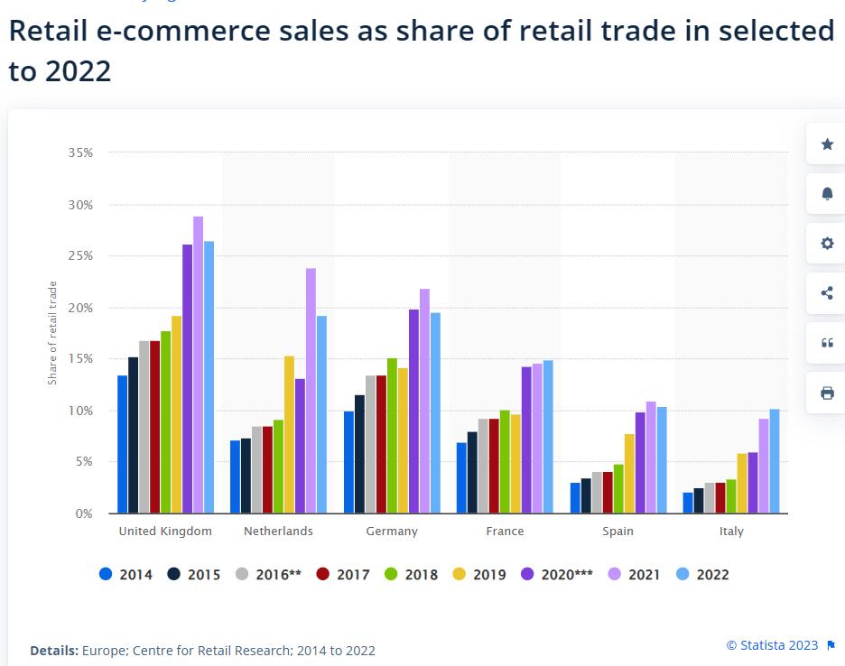 表2. 2014-2022 年,英、荷、德、法、西、意欧洲六国电商零售额占本国零售交易总额比例 | 来源:Statista