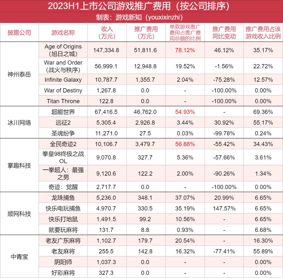 而这并不一定意味着公司缩减了推广费用。实际上,推广成本都被集中到了主力游戏身上,可以说是「把钱花在了刀刃上」。这在按照公司排列的下表中可以看得更明显。