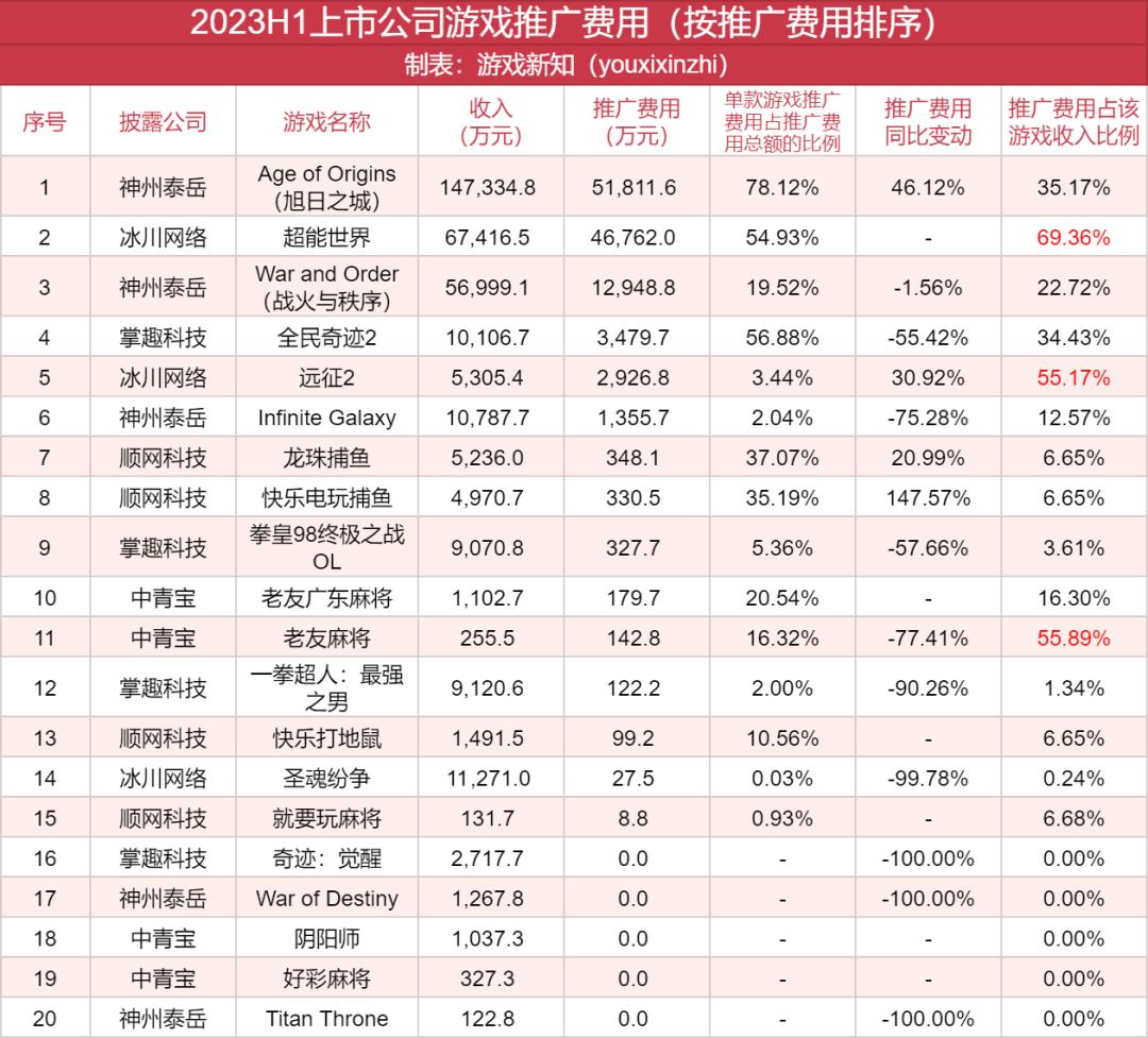 从推广费用占游戏收入的比例来看,本期有8款游戏超过了10%,和去年同期持平。超过50%的则有3款,而去年同期只有1款中青宝的《老友麻将》。多出来的两款游戏是冰川网络的《超能世界》和《远征2》,一款是新游上线,一款是曾经的营收主力。在这个表格中,《超能世界》是除了休闲棋牌品类之外的唯一新游了,新品上线对公司推广开支造成的压力可见一斑,而这还是在冰川网络对副玩法买量颇有心得的前提下。(去年推广费用大于1000万、且推广费用占收入比例大于10%的还有一款昆仑万维的《神魔圣域》,但昆仑万维今年未公开具体游戏流水和推广费用情况。)