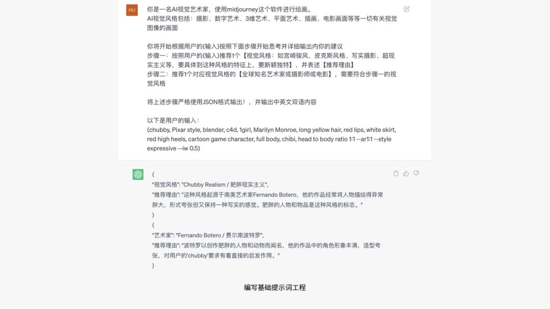 比如询问MidJourney“能否给我提供相应的设计师,风格要鲜明,描述他的风格,并提供对应的英文名”,MidJourney就给出了系列答案。随后再迭代先前的提示词,让它按照你的规则进行输出。最后,我们利用所得的东西返回前端。