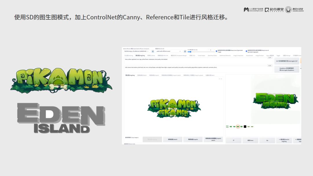 地图资产的生成也遵循大致相同的逻辑,即使用SD进行原始地图生成,再使用MJ生成地皮纹理;游戏Logo资产也大致类似,使用SD的图生图模式,加上ControlNet的Canny、Reference和Tile进行风格迁移。我唯一做的事情,便是用PS生成了一个底图垫进去。
