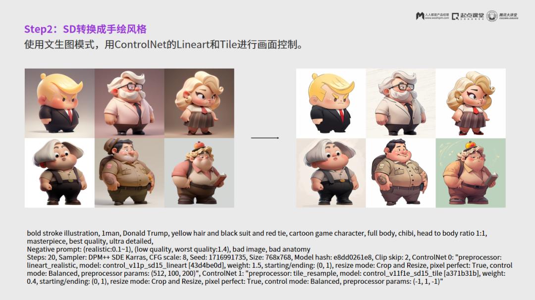 人物资产相对复杂一些,最后,我们通过MJ的皮克斯风格实现对产出效果的控制,并使用SD文生图加上ControlNet去统一风格。可以看到,每个角色的形态都非常稳定, MJ生成了稳定角色,再利用SD转换成手绘风格。