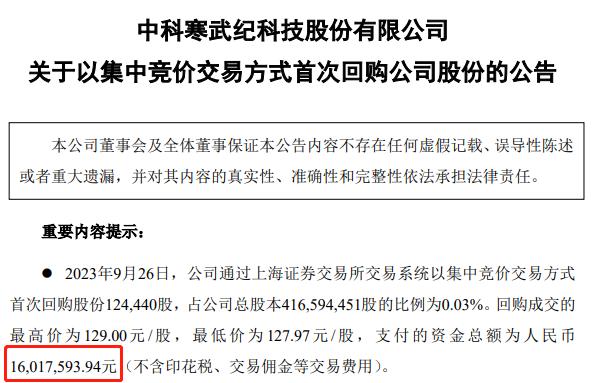 昨日(9月26日)收盘后,寒武纪发布《关于以集中竞价交易方式首次回购公司股份的公告》。该公告显示,寒武纪昨日通过上交所交易系统以集中竞价交易方式首次回购股份12.44万股,占公司总股本的0.03%。回购成交的最高价为129元/股,最低价为127.97元/股,支付的资金总额为1601.76万元。