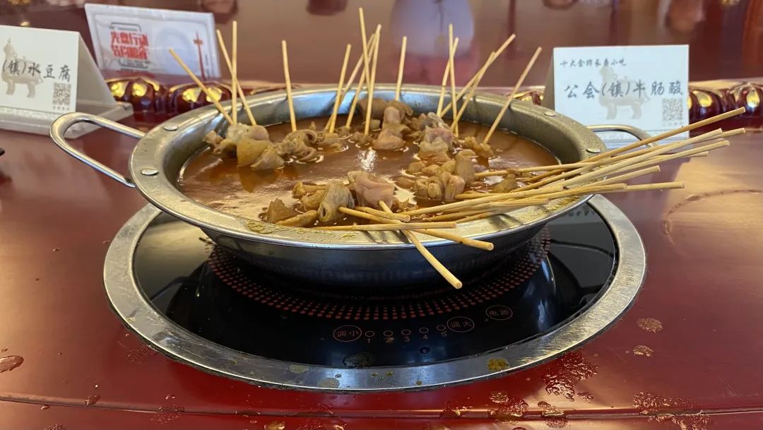 当地人将牛肠、牛肺、牛心等牛杂洗净切成小段或块,用竹签串成小串,装在一个大盆子里,煨在锅里面卖。