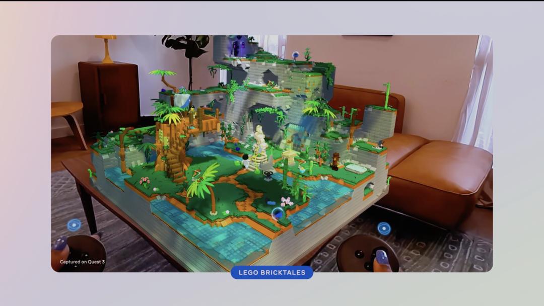 发布会最早出现的应用,便是乐高 Lego Bricktales 的 MR 游戏,之前这款游戏只能在平面屏幕中玩,现在 Meta 现在可以让你用 Quest 3 的 MR 功能在客厅实景里玩。