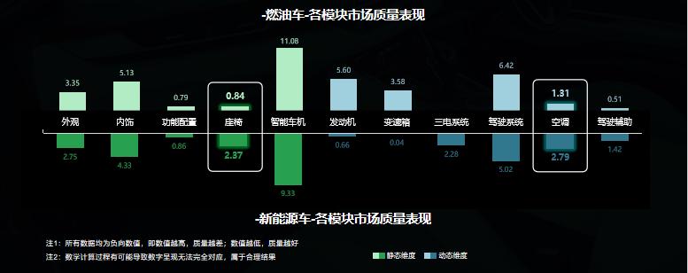 新能源车座椅和空调模块表现不及燃油车。除座椅和空调模块,新能源车在大部分二级模块表现优于燃油车,但空调“热得慢”“不够热”是典型问题,且出现的时间更早,行驶里程更短,更集中在较新的年款车型上。座椅问题更多出现在高端车型,多为“座椅凹陷”“舒适性差”等感知类问题。