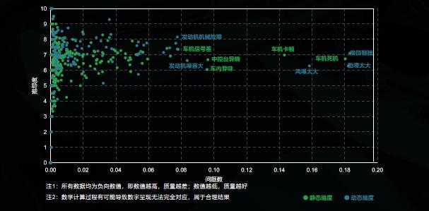 燃油车动力总成类问题减少,发动机机械故障抱怨度高。2022年TOP10清单中的“变速箱异响”和“油耗太高”问题数、抱怨度下降,未出现在今年TOP10问题榜单中,但车身做工、驾驶噪音方面用户反馈的问题数、抱怨度增加。