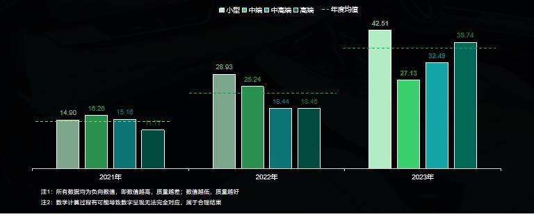 受座椅舒适性等感知问题影响,新能源车抱怨度随车型级别提升而增加。不过今年的研究中,“剩余电量/续航不准”“语音交互误唤醒“减震太硬”等问题,未出现在TOP10榜单上。