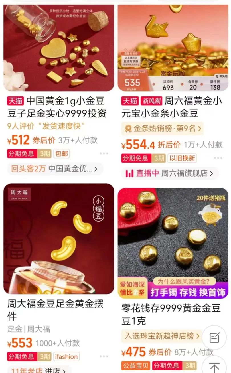 即使是瞄准投资需求的金豆豆、金瓜子这类产品,也免不了少量溢价。 例如,中国黄金的1克金豆豆售价496元,周大福、周大生的1克小金豆售价550元,均高于基础金价。可以预见,买它们要想赚钱,需要等待金价上涨到更高的时候。